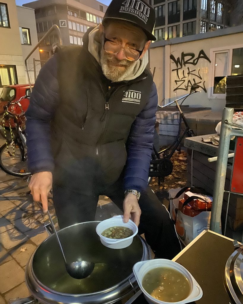 Zwischen den Häusern, den Fahrrädern und dem stetigen Trubel um den Weihnachtsmarkt in der Stadt, sorgte das Team für einen Ankerpunkt. Der dampfende Suppenkessel von der Herzendwärme Duisburg e.V. stand bereit und jede Portion wurde mit Aufmerksamkeit, Ruhe und Respekt ausgegeben. Viele der Besucher nutzten die Gelegenheit, um kurz inne zu halten, sich von innen aufzuwärmen und ein paar Worte zu wechseln- denn bei Geben gibt geht es nicht nur um Essen, sondern auch um Begegnung.