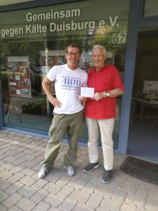 Nun hatte Sammy die ersten 10 Shirts. Nächster Post auf Facebook, dass es die Dinger gab. Und siehe da – niemand, aber auch wirklich niemand brauchte dieses Shirt. Toll. Und Sammy brauchte auch keine 10 Shirts. Relativ zügig kam der Gedanke: Dann weg für einen guten Zweck. Sammy hörte mal was von Gemeinsam gegen Kälte. Die schienen sich um Obdachlose zu kümmern. Da Sammy selbst mal eine Zeit ohne festen Wohnsitz war, fiel die Entscheidung nicht schwer. Nächste Meldung auf Facebook: Ein Teil des Erlöses geht an Gemeinsam gegen Kälte mit Sitz auf der Wintgenstrasse in Duissern, nahe dem alten Arbeitsamt. Und siehe da, binnen drei Tagen waren alle Shirts weg, und es mussten neue bestellt werden. Bei dem Gespräch mit Mirko legte Sammy die Karten offen auf den Tisch. Als Hartz4 Empfänger gab es kein Spielgeld für eine große Bestellung oder für ein Lager mit T-Shirts. Sofort war Mirko bereit, auf Zuruf zu produzieren. Sammy konnte Bestellungen einsammeln, und Mirko zauberte die Shirts in kurzer Zeit. Zu traumhaften Konditionen, denn Mirko hat heute noch das Herz auf dem rechten Fleck und wollte sich im Namen der guten Sache auch nicht bereichern. Nach einigen Wochen hatte Sammy also einen Umschlag mit Geld zu Hause, rief bei Gemeinsam gegen Kälte an und bekam e Audienz bei Kurt Schreiber, dem damaligen ersten Vorsitzenden des Vereins.